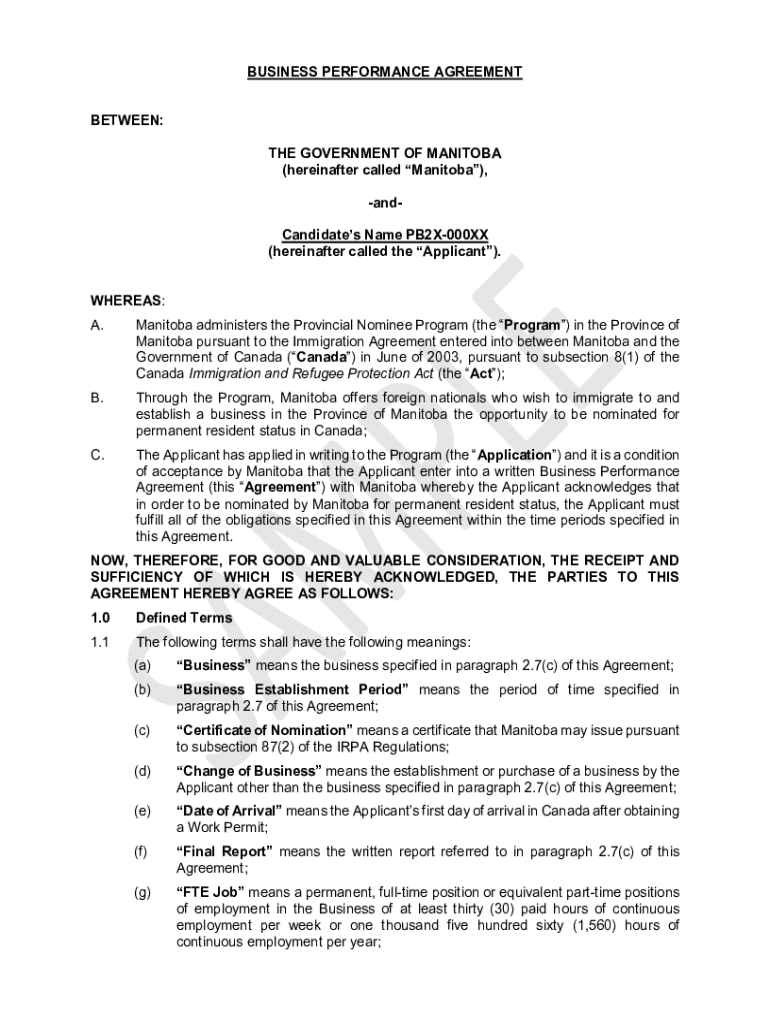 BUSINESS PERFORMANCE AGREEMENT BETWEEN: THE GOVERNMENT OF MANITOBA (hereinafter called Manitoba), candidates Name PB2X000XX (hereinafter called the Applicant). WHEREAS: A. Manitoba administers the