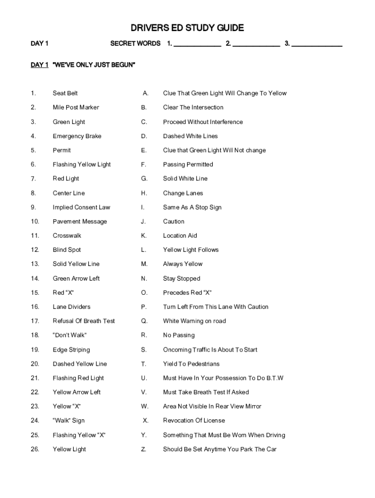 DRIVERS ED STUDY GUIDE DAY 1SECRET WORDS1. ___ 2. ___ 3. ___DAY 1 WE'VE ONLY JUST BEGUN1. Seat Belt. Clue That Green Light Will Change To Yellow2. Mile Post Marker. Clear The Intersection3. Green