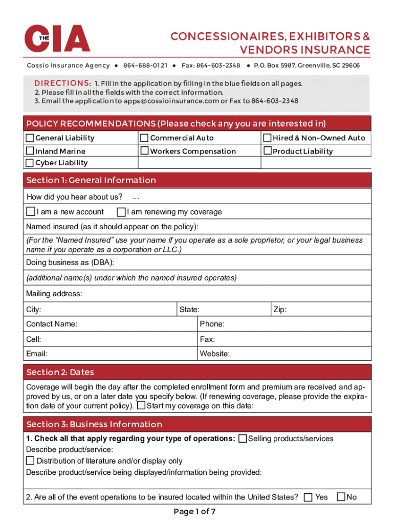 CONCESSIONAIRES, EXHIBITORS & VENDORS INSURANCETHECossio Insurance Agency8646880121Fax: 8646032348P. O. Box 5987, Greenville, SC 29606DIRECTIONS: 1. Fill in the application by lying in the blue ends
