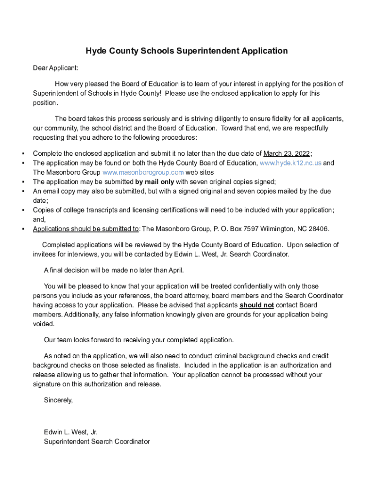 Hyde County Schools Superintendent Application Dear Applicant: How very pleased the Board of Education is to learn of your interest in applying for the position of Superintendent of Schools in Hyde