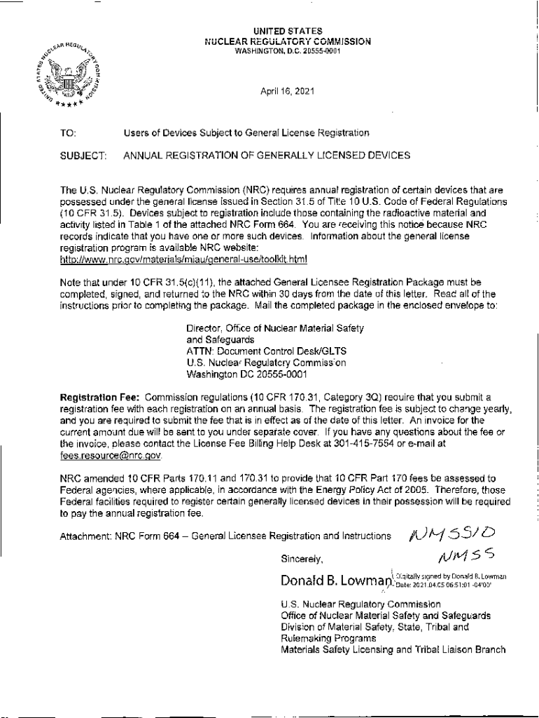 WASHINGTON, D.C. 205550001April 16, 2021TO:Users of Devices Subject to General License RegistrationSUBJECT:ANNUAL REGISTRATION OF GENERALLY LICENSED Devices