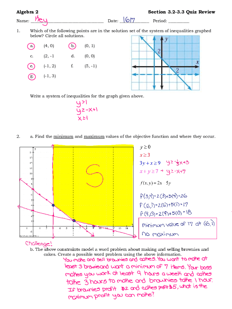 Algebra 2Section 3.23.3 Quiz Reviewable: ___ Date: ___ Period: ___ 1. Which of the following points are in the solution set of the system of inequalities graphed below? Circle all solutions. a.(4,