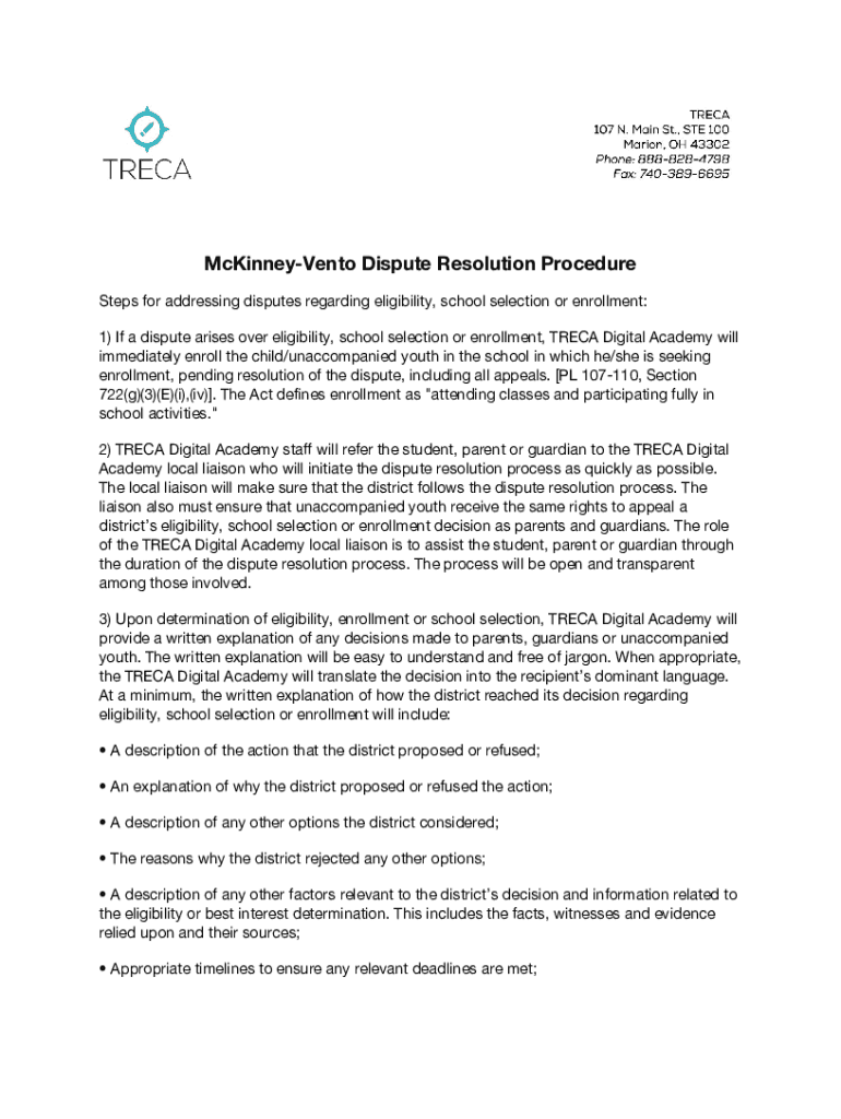 McKinneyVento Dispute Resolution Procedure Steps for addressing disputes regarding eligibility, school selection or enrollment: 1) If a dispute arises over eligibility, school selection or enrollment,