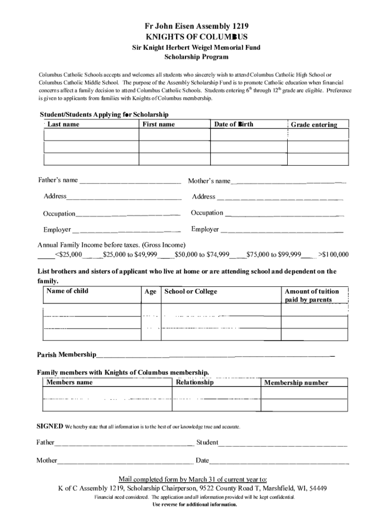 Fr John Risen Assembly 1219 KNIGHTS OF Columbus Knight Herbert Wage Memorial Fund Scholarship Program Columbus Catholic Schools accepts and welcomes all students who sincerely wish to attend Columbus