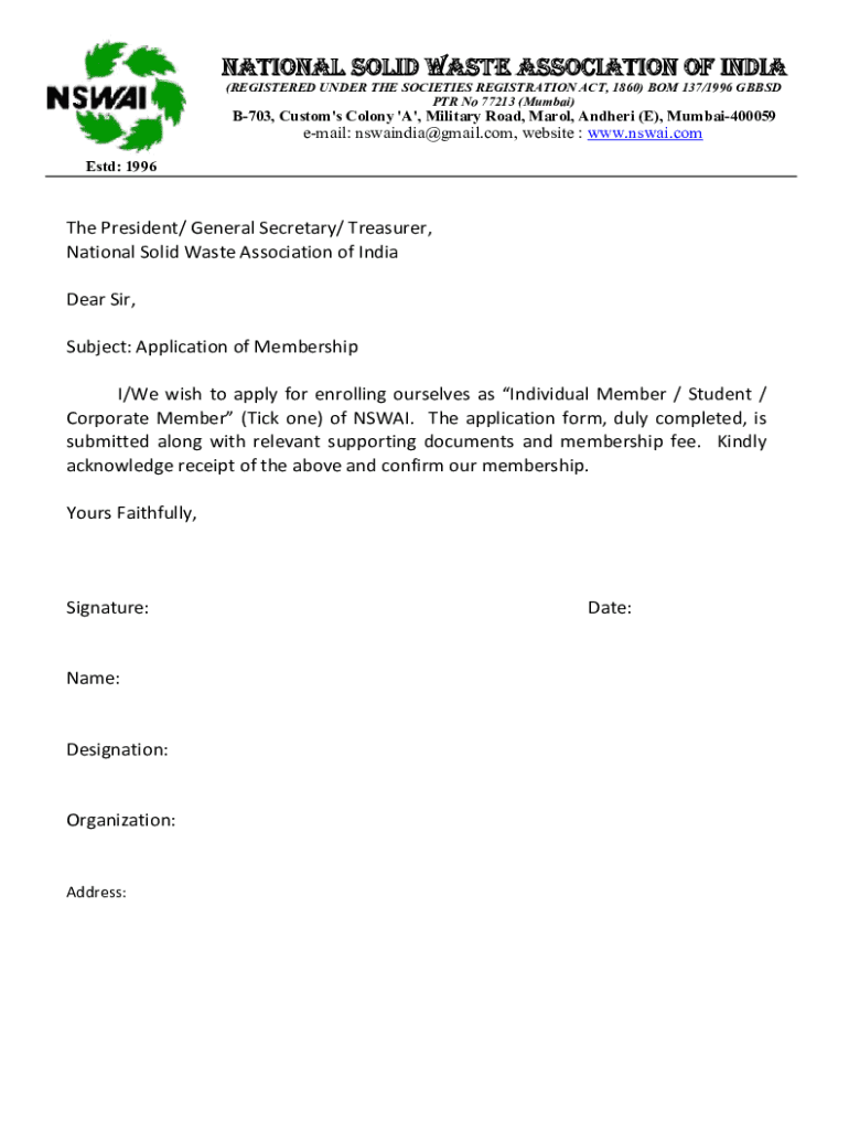 NATIONAL SOLID WASTE ASSOCIATION OF INDIA (REGISTERED UNDER THE SOCIETIES REGISTRATION ACT, 1860) BOM 137/1996 GB BSD PTR No 77213 (Mumbai)B703, Custom\'s Colony \'A\', Military Road, Carol, Adhere