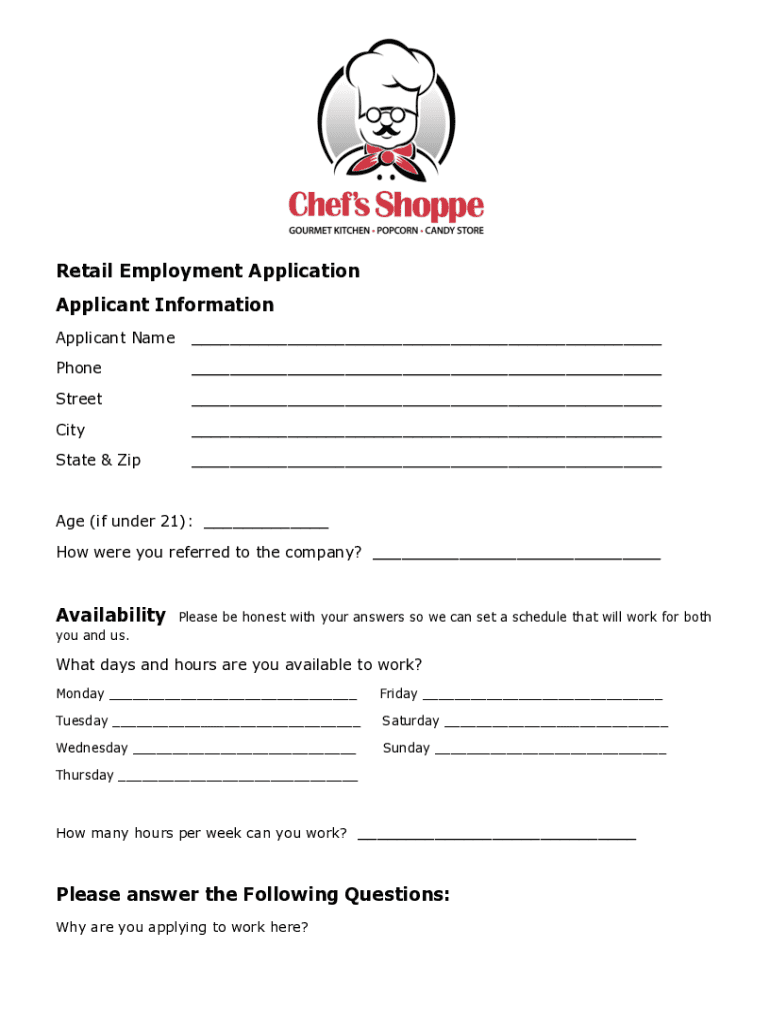 Retail Employment Application Applicant Information Applicant Name___Phone___Street___City___State & Zip___Age (if under 21): ___ How were you referred to the company? ___AvailabilityPlease be honest