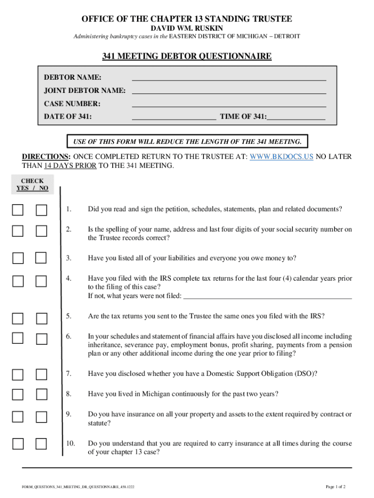 OFFICE OF THE CHAPTER 13 STANDING TRUSTEE DAVID WM. RUSKIN Administering bankruptcy cases in the EASTERN DISTRICT OF MICHIGAN DETROIT341 MEETING DEBTOR QUESTIONNAIRE DEBTOR NAME:___JOINT DEBTOR NAME: