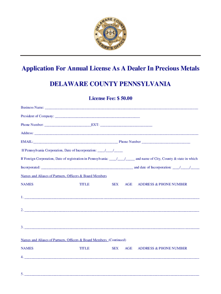 Application For Annual License As A Dealer In Precious Metals DELAWARE COUNTY PENNSYLVANIA License Fee: $50.00 Business Name: ___ President of Company: ___ Phone Number: ___EXT: ___ Address: ___ EMAIL:___