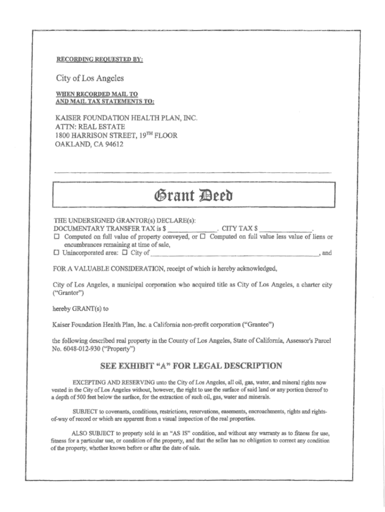 RECORDING REQUESTED BY:City of Los Angeles WHEW RECORDED MAIL TO AWD MAIL TAX STATEMENTS TO:KAISER FOUNDATION HEALTH PLAN, INC. ATTN: REAL ESTATE 1800 HARRISON STREET, 19 FLOOR OAKLAND, CA 94612#rant