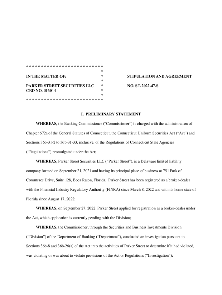 ************************** * IN THE MATTER OF: * * PARKER STREET SECURITIES LLC * CRD NO. 316044 * * **************************STIPULATION AND AGREEMENT NO. ST202247SI. PRELIMINARY STATEMENT WHEREAS,