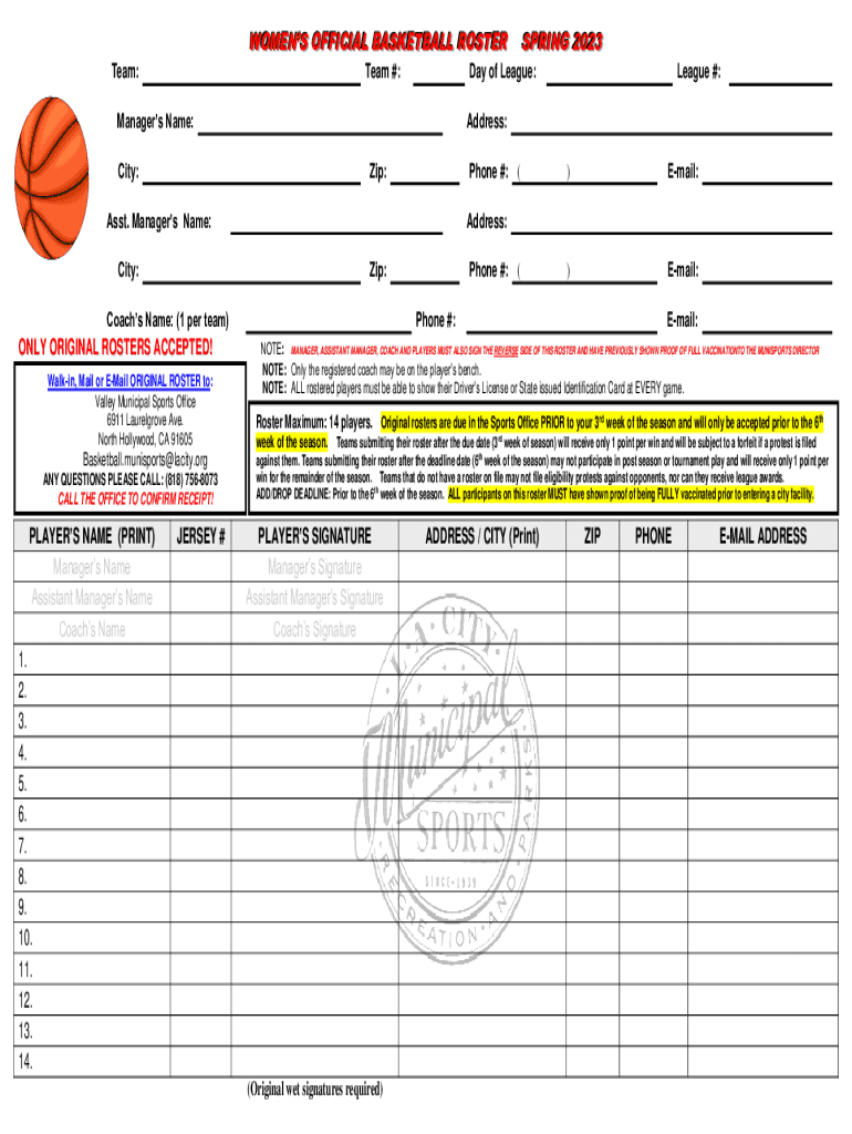 W TO OM ME EN NS SO OFFFFIIC CIA ALL B BA AS SK KE ET TB BA ALL LL R RO OS ST TE ER R Team:Team #:Day of League:Managers Name: Zip:Phone #: (Asst. Managers Name: Zip:Coach Name: (1 per team)Basketball.munisports@lacity.org