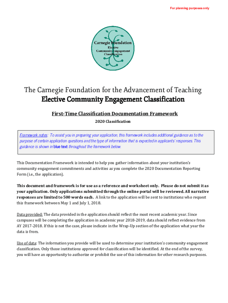 For planning purposes Blythe Carnegie Foundation for the Advancement of Teaching Elective Community Engagement Classification First-time Classification Documentation Framework 2020 ClassificationFramework