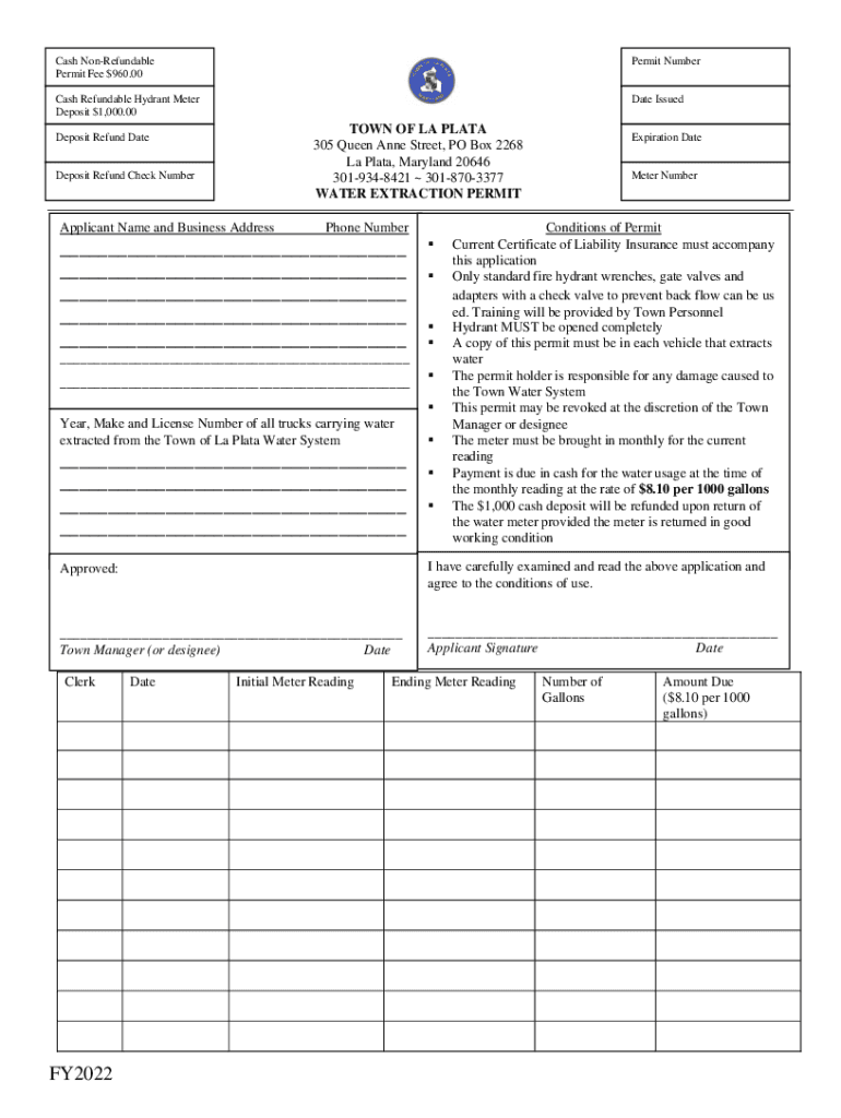 Cash NonRefundable Permit Fee $960.00Permit Number Cash Refundable Hydrant Meter Deposit $1,000.00Date IssuedTOWN OF LA PLATE 305 Queen Anne Street, PO Box 2268 La Plate, Maryland 20646 3019348421
