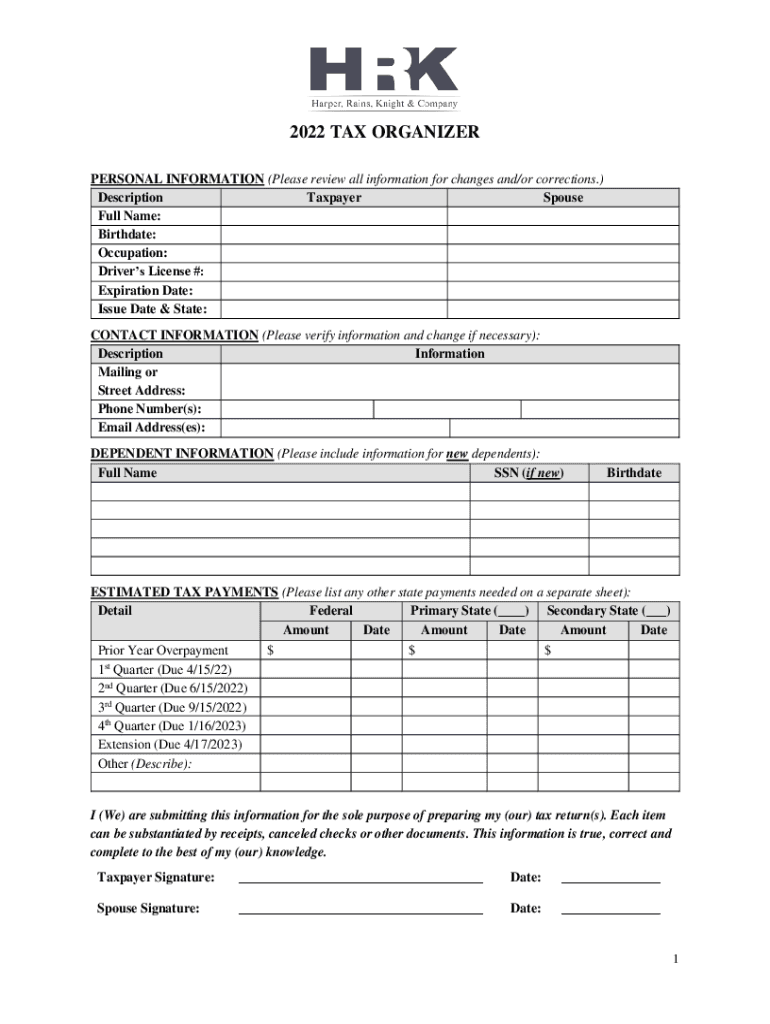 2022 TAX ORGANIZER PERSONAL INFORMATION (Please review all information for changes and/or corrections.) Description Taxpayer Spouse Full Name: Birthdate: Occupation: Driver's License #: Expiration
