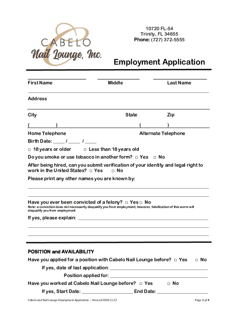 10720 FL54 Trinity, FL 34655 Phone: (727) 3725555Employment Application ___ First Name___ Middle___ Last Name___ Address City (State)Zip (Home Telephone)Alternate TelephoneBirth Date: ___ / ___ /
