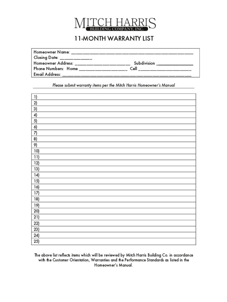11MONTH WARRANTY LIST Homeowner Name: ___ Closing Date: ___ Homeowner Address: ___ Subdivision ___ Phone Numbers: Home ___ Cell ___ Email Address: ___ Please submit warranty items per the Mitch Harris