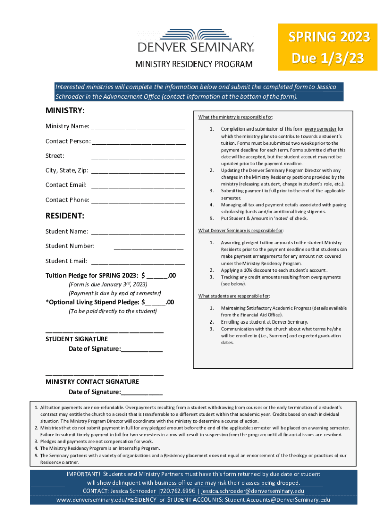 MINISTRY RESIDENCY PROGRAMMING 2023 Due 1/3/23Interested ministries will complete the information below and submit the completed form to Jessica Schroeder in the Advancement Office (contact information