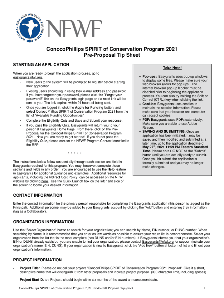 ConocoPhillips SPIRIT of Conservation Program 2021 Proposal Tip Sheet STARTING AN APPLICATION When you are ready to begin the application process, go to easy grants.NFF.org. New users to the system