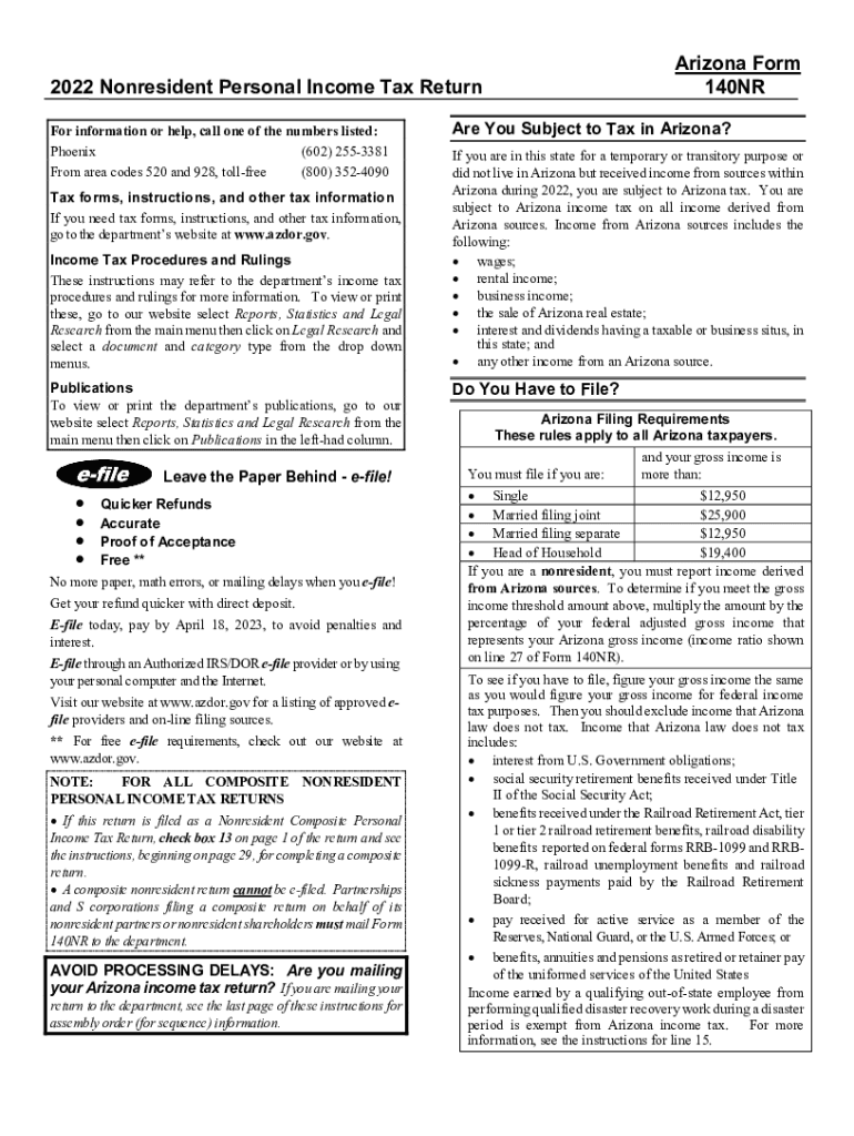 Arizona Form 140NR2022 Nonresident Personal Income Tax Return For information or help, call one of the numbers listed: Phoenix (602) 2553381 From area codes 520 and 928, toll-free (800) 3524090 Tax