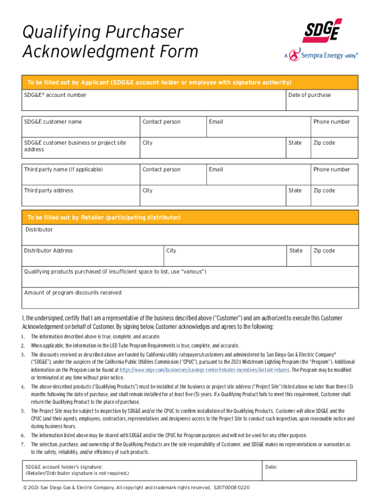 Qualifying Purchaser Acknowledgment Form To be filled out by Applicant (SDGE account holder or employee with signature authority) SDGE account numerate of purchaseSDG&E customer recontact personage