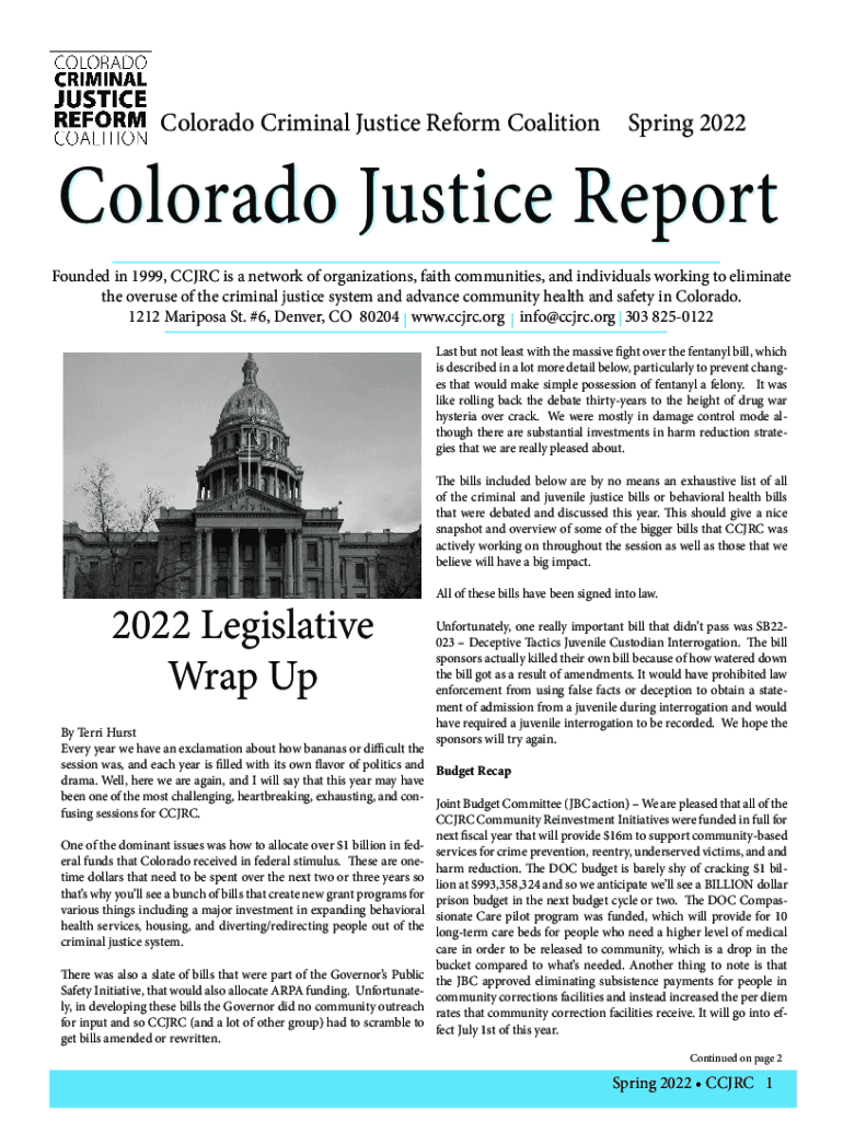 Colorado Criminal Justice Reform CoalitionSpring 2022Colorado Justice Report Founded in 1999, CC JRC is a network of organizations, faith communities, and individuals working to eliminate the overuse