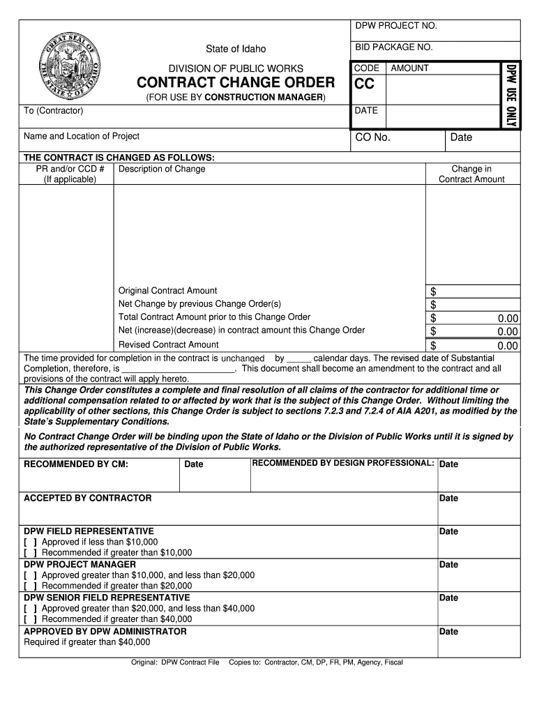 DPW PROJECT NO. State of Idaho BID PACKAGE NO. CODE CONTRACT CHANGE ORDER CC DPW USE ONLY DIVISION OF PUBLIC WORKS AMOUNT (FOR USE BY CONSTRUCTION MANAGER) To (Contractor) DATE Name and Location of