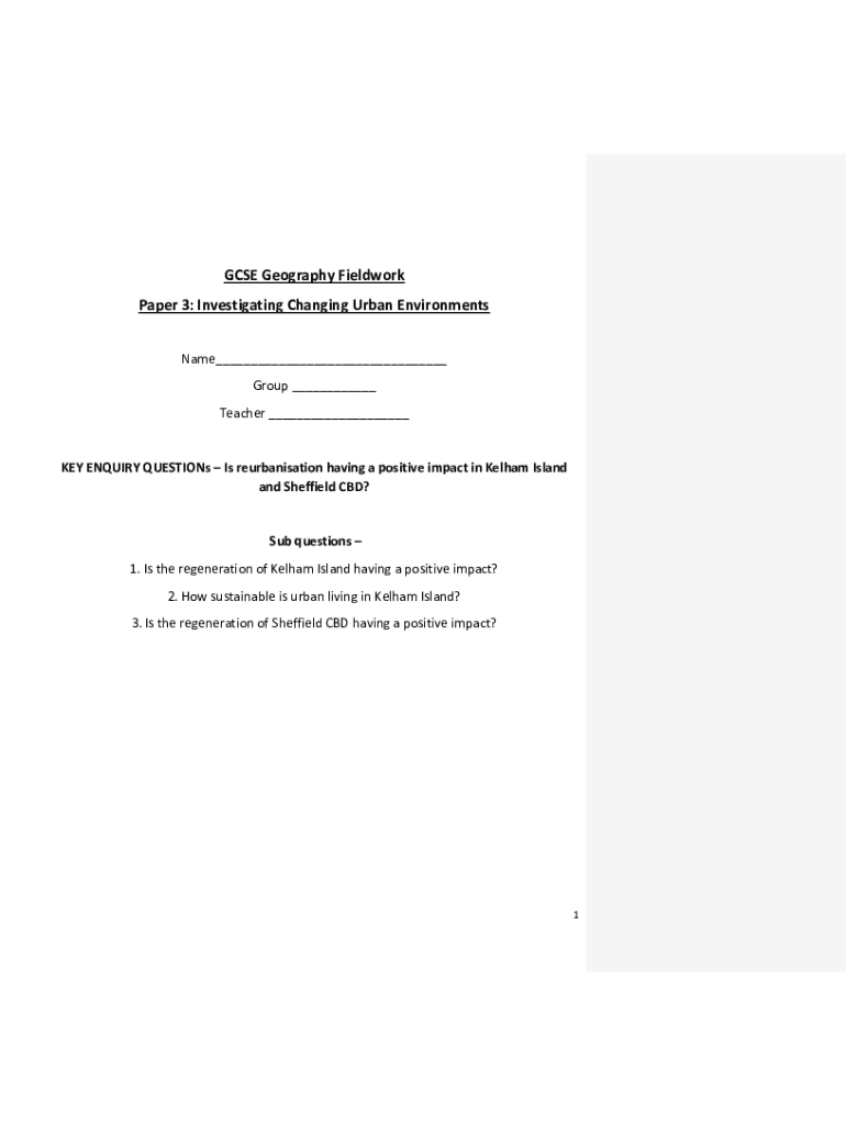 GCSE Geography Fieldwork Paper 3: Investigating Changing Urban Environments Name___ Group ___ Teacher ___KEY Inquiry Questions Is reorganization having a positive impact in Kelham Island and Sheffield