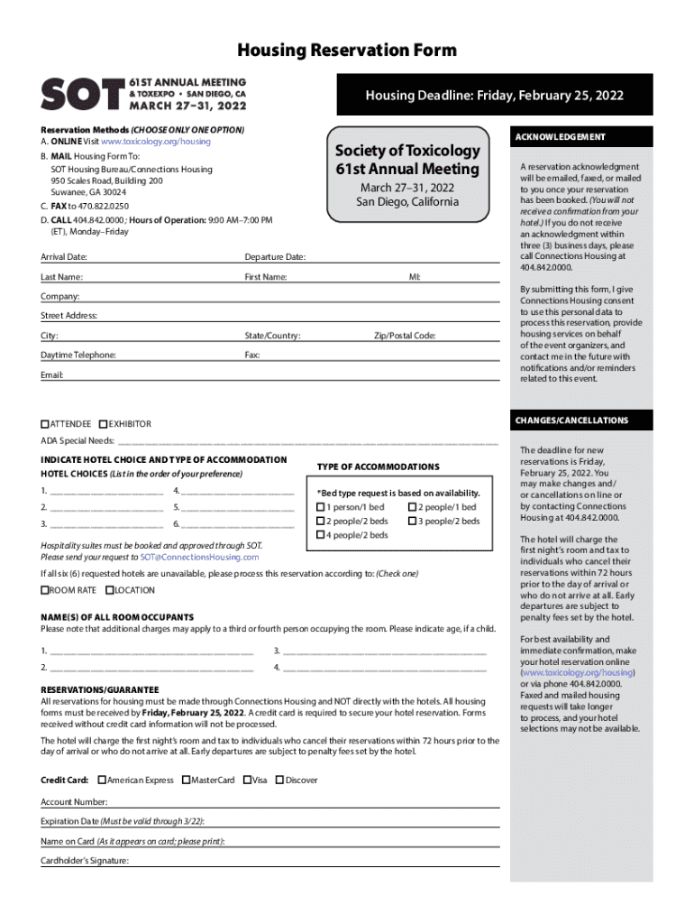 Housing Reservation Form Housing Deadline: Friday, February 25, 2022, Reservation Methods (CHOOSE ONLY ONE OPTION) A. ONLINE Visit www.toxicology.org/housingSociety of Toxicology 61st Annual Meeting.
