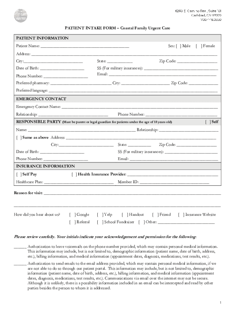 PATIENT INTAKE FORM Coastal Family Urgent Care PATIENT INFORMATION Patient Name: ___Sex: [ ] Male[ ] FemaleAddress: ___ City:___State: ___Date of Birth: ___SS (For military insurances): ___ Email: