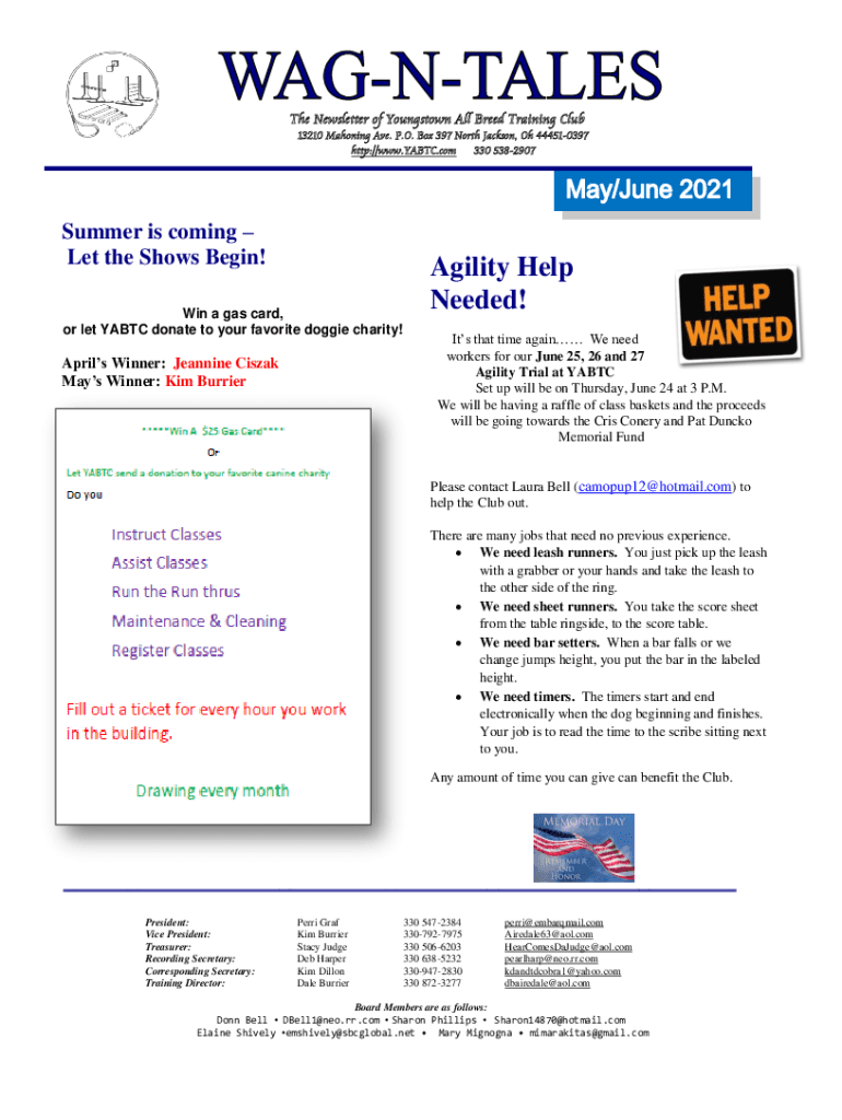The Newsletter of Youngstown All Breed Training Club 13210 Mahoning Ave. P.O. Box 397 North Jackson, Oh 444510397 http://www.YABTC.com 330 5382907Summer is coming Let the Shows Begin! Win a gas card,