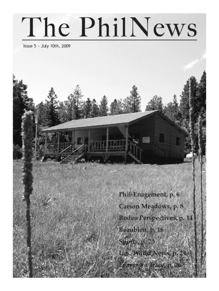 The Philters Issue 5 July 10th, 2009PhilEnagement, p. 6 Carson Meadows, p. 8 Rodeo Perspectives, p. 14 Beauties, p. 16 Sports, p. 20 U.S./World News, p. 24 Leaving a Trace, p. 26PhilNewsTen Years