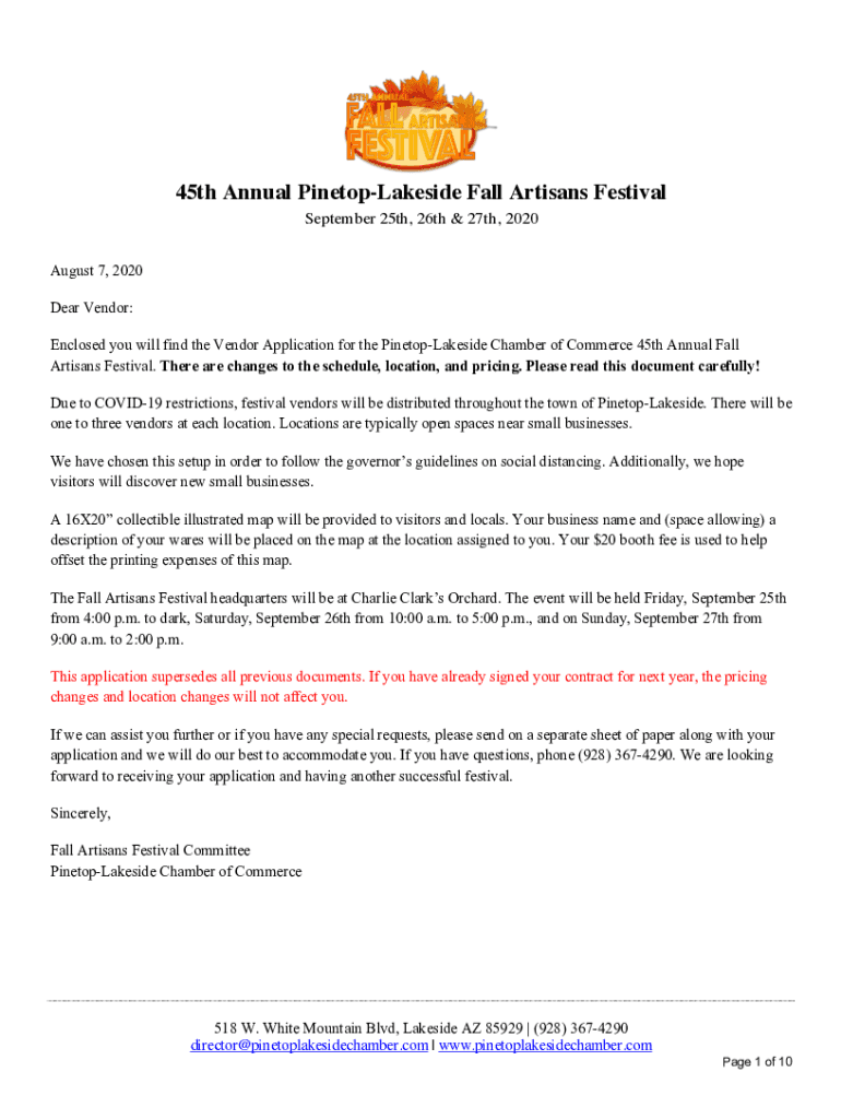 45th Annual PinetopLakeside Fall Artisans Festival September 25th, 26th & 27th, 2020 August 7, 2020, Dear Vendor: Enclosed you will find the Vendor Application for the PinetopLakeside Chamber of Commerce