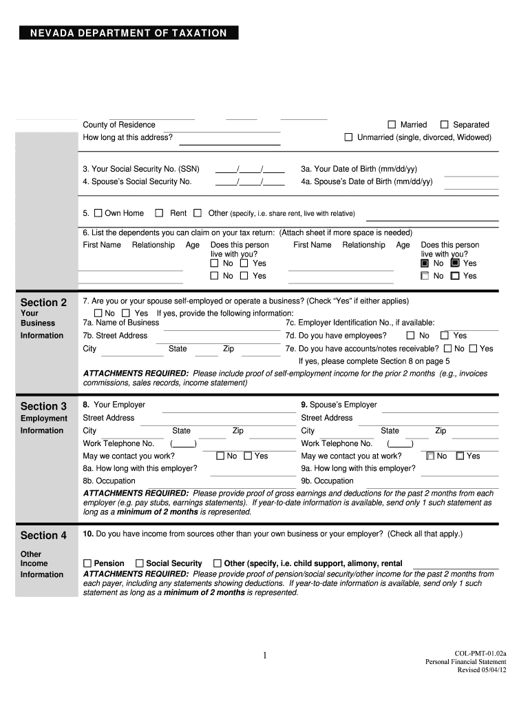 NEVADA DEPARTMENT OF TAXATION TID: PERSONAL FINANCIAL STATEMENT Section 1 1. Full Name (s) Personal Information 1a. Home Telephone () Spouse s Name Street Address City State Zip 2. Marital Status: