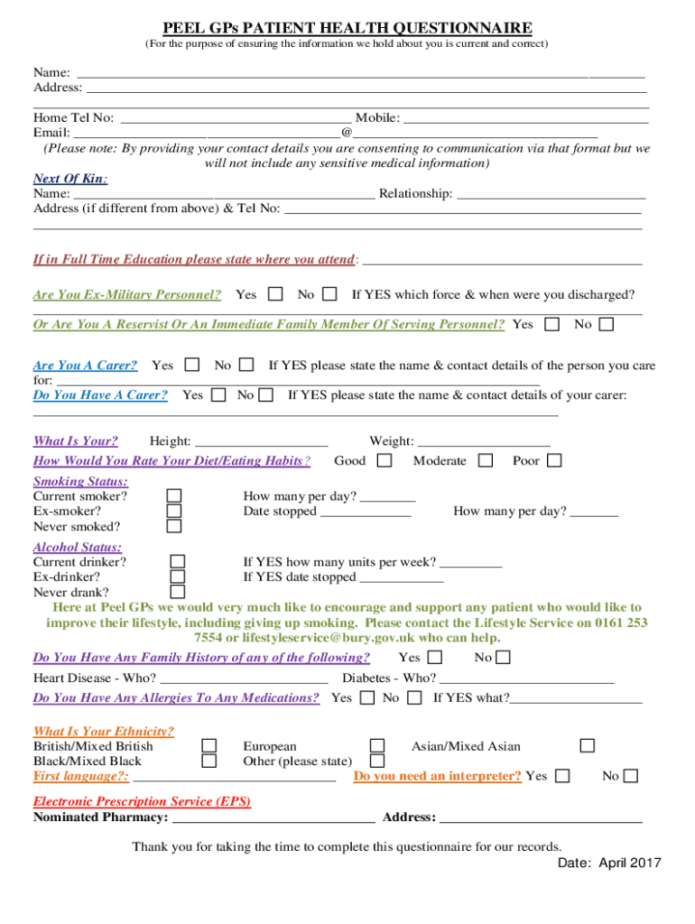 PEEL GP's PATIENT HEALTH QUESTIONNAIRE (For the purpose of ensuring the information we hold about you is current and correct)Name: ___ Address: ___ ___ Home Tel No: ___ Mobile: ___ Email: ___@___