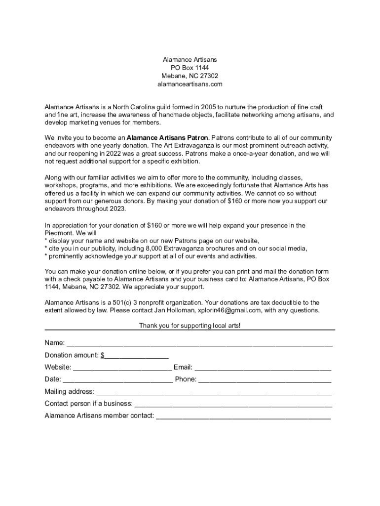 Alliance Artisans PO Box 1144 Me bane, NC 27302 alamanceartisans.com Alliance Artisans is a North Carolina guild formed in 2005 to nurture the production of fine craft and fine art, increase the awareness