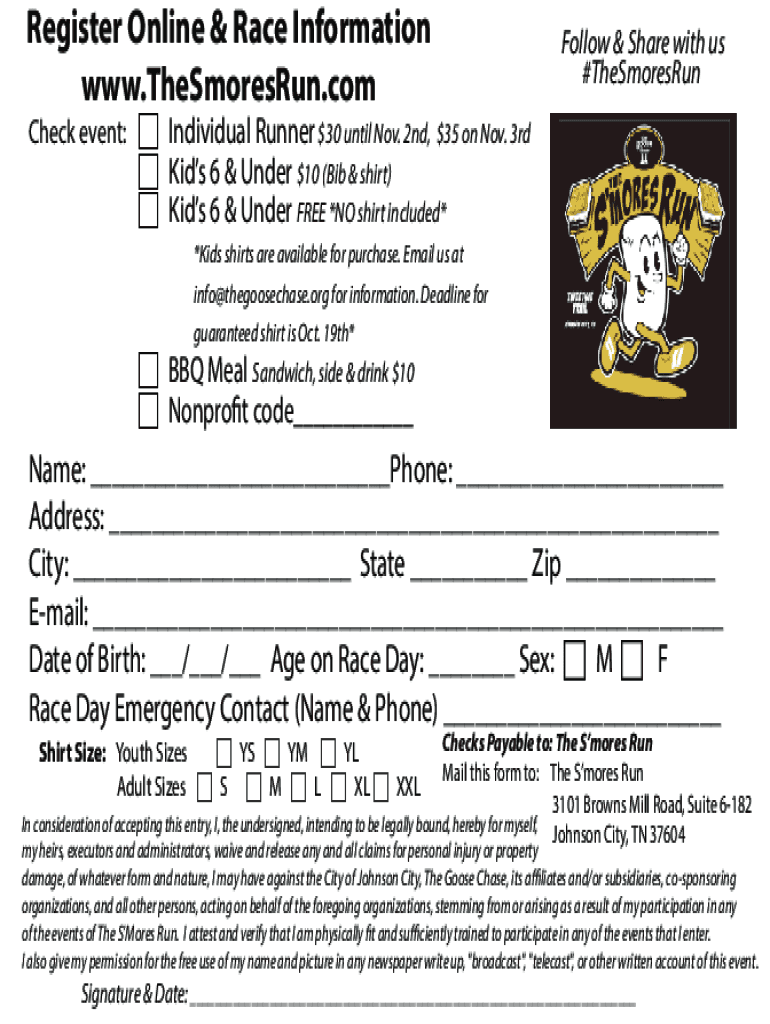 Register Online & Race Information www.TheSmoresRun.comFollow & Share with us #TheSmoresRunCheck event: Individual Runner $30 until Nov. 2nd, $35 on Nov. 3rd Kids 6 & Under $10 (Bib & shirt) Kids