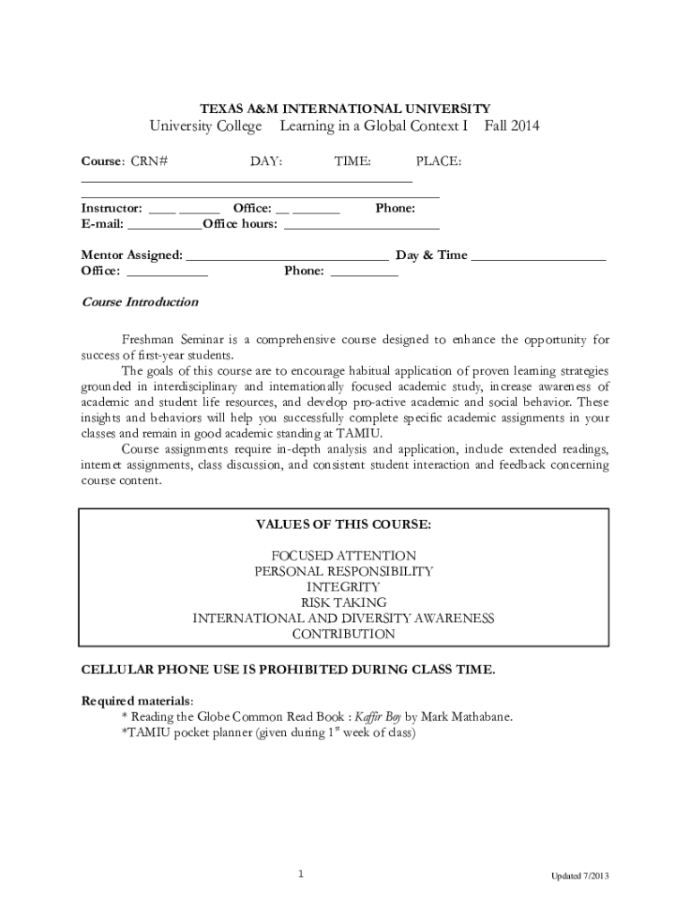 TEXAS A&M INTERNATIONAL UNIVERSITYUniversity CollegeLearning in a Global Context I Fall 2014Course: CRN# DAY: TIME: PLACE: ___ ___ Instructor: ___ ___ Office: __ ___ Phone: Email: ___ Office hours: