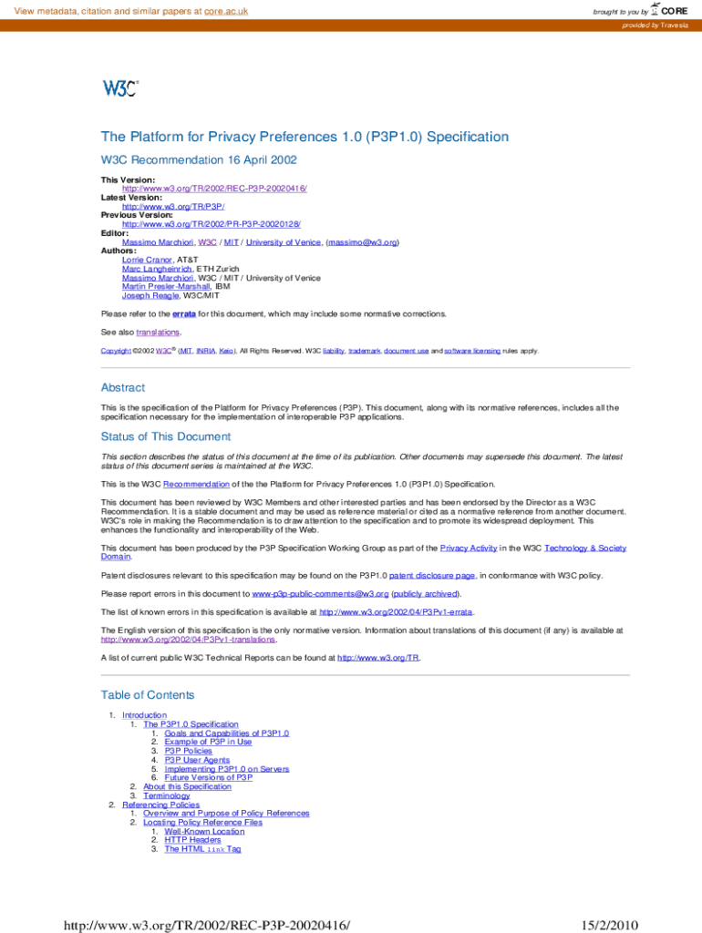 The citation Platform for Privacy Preferences View metadata, and similar papers at core.ac.uk1.0 (P3P1.0) SpecificationPagebrought 1 ofto58 you byCOREprovided by Travesty Platform for Privacy Preferences