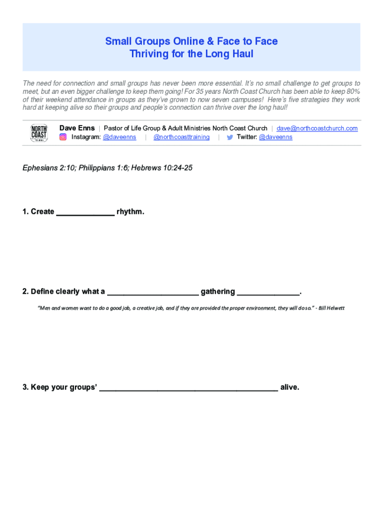 Small Groups Online & Face to Face Thriving for the Long Haul The need for connection and small groups has never been more essential. Its no small challenge to get groups to meet, but an even bigger
