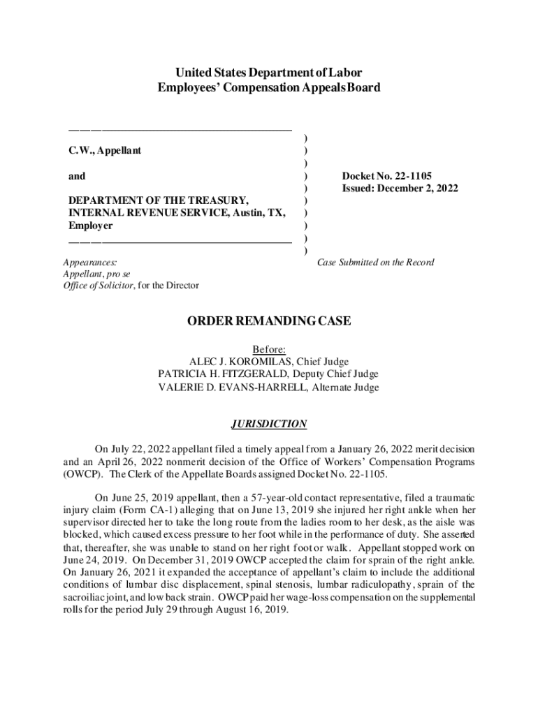 United States Department of Labor Employees Compensation Appeals Board ___ C.W., Appellant and DEPARTMENT OF THE TREASURY, INTERNAL REVENUE SERVICE, Austin, TX, Employer ___))))))))))Appearances: