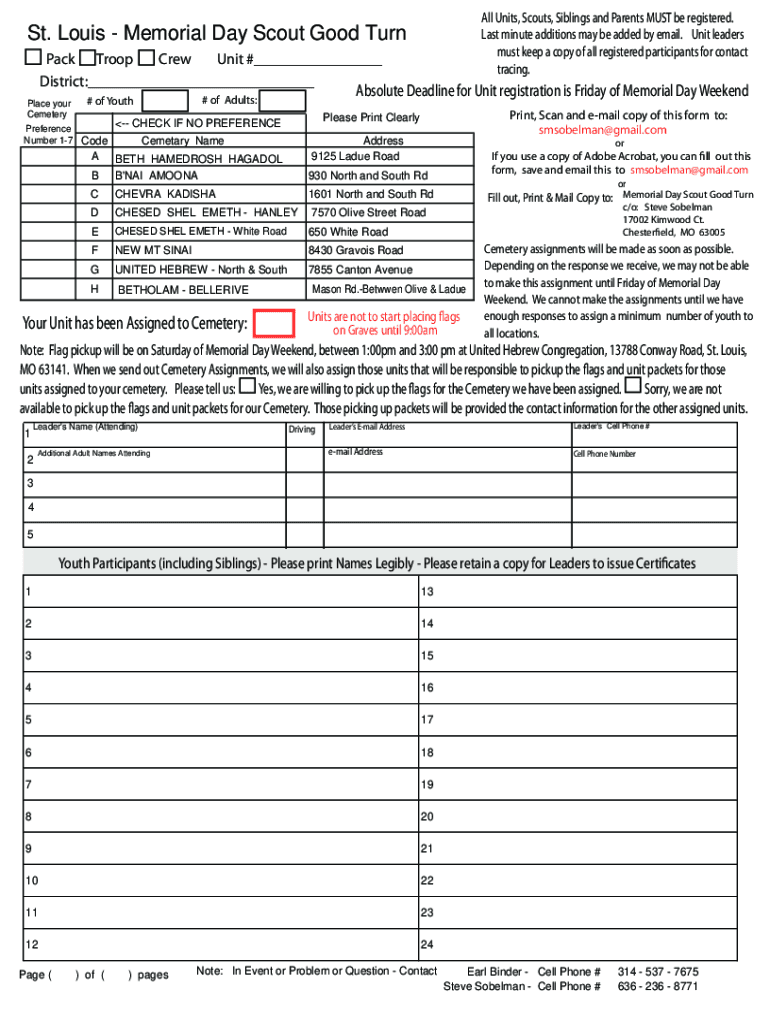 All Units, Scouts, Siblings and Parents MUST be registered. Last minute additions may be added by email. Unit leaders must keep a copy of all registered participants for contact tracing. St. Louis