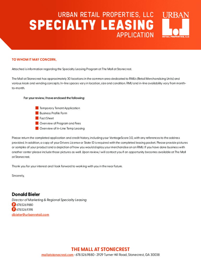 URBAN RETAIL PROPERTIES, SPECIALTY LEASING APPLICATION TO WHOM IT MAY CONCERN, Attached is information regarding the Specialty Leasing Program at The Mall at Stone crest. The Mall at Stone crest has