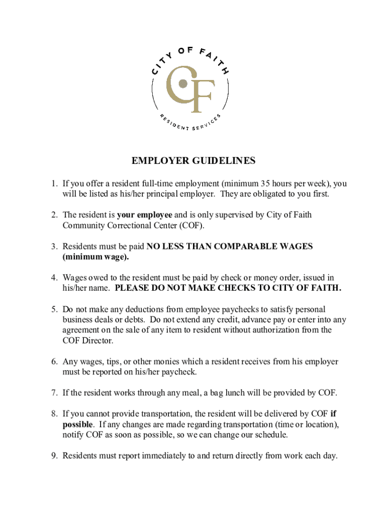 EMPLOYER GUIDELINES 1. If you offer a resident full time employment (minimum 35 hours per week), you will be listed as his/her principal employer. They are obligated to you first. 2. The resident