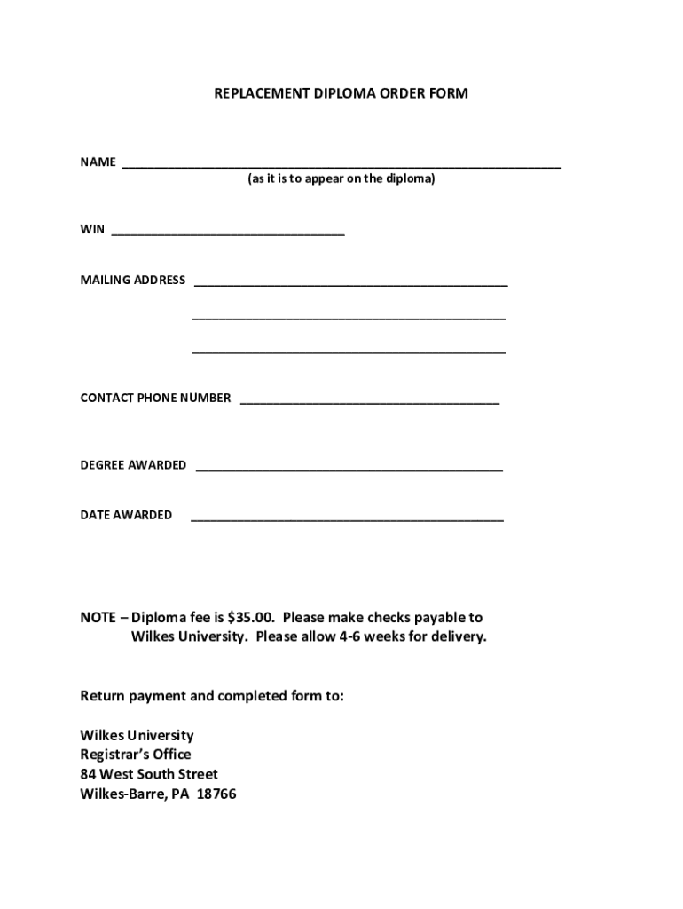 REPLACEMENT DIPLOMA ORDER FORENAME___(as it is to appear on the diploma)WIN___MAILING ADDRESS_________CONTACT PHONE NUMBER___DEGREE AWARDED___DATE AWARDED___NOTE Diploma fee is $35.00. Please make