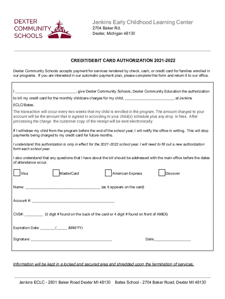 Jenkins Early Childhood Learning Center 2704 Baker Rd. Dexter, Michigan 48130CREDIT/DEBIT CARD AUTHORIZATION 20212022 Dexter Community Schools accepts payment for services rendered by check, cash,