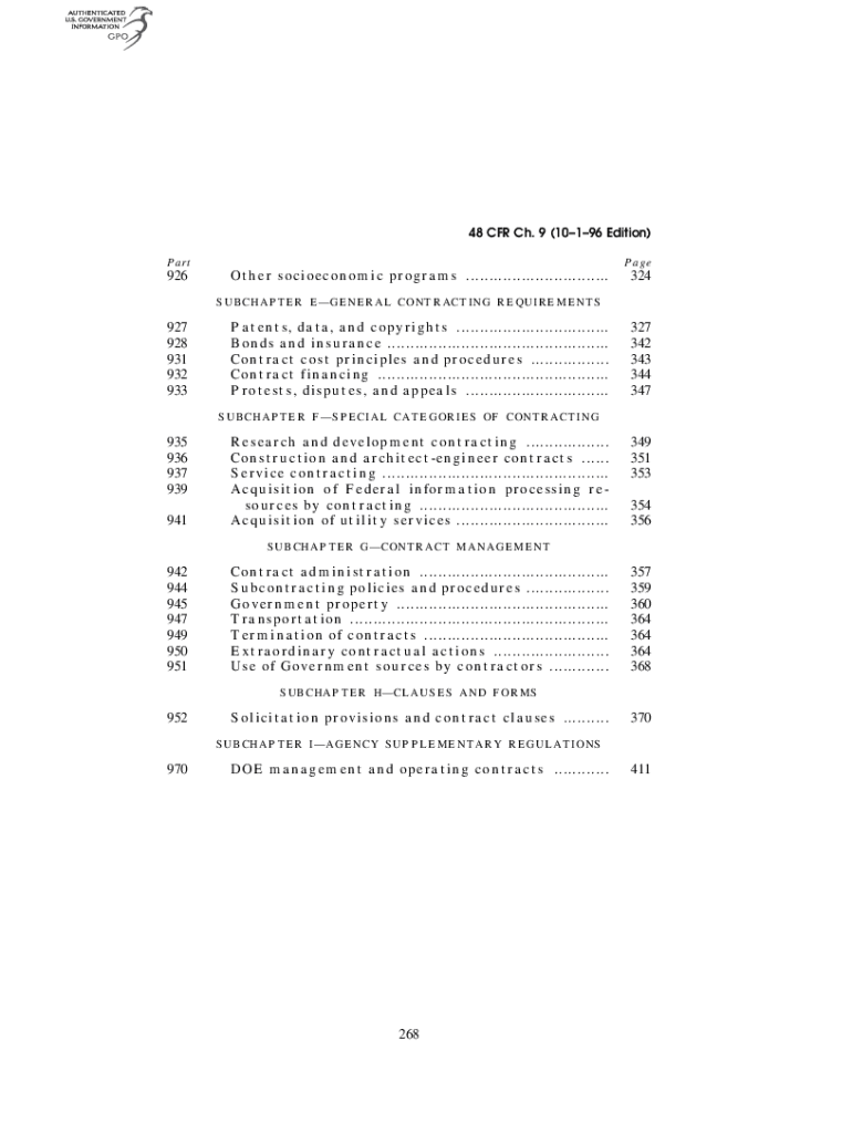 48 CFR Ch. 9 (10196 Edition) Part926PageOther socioeconomic programs ...............................324SUBCHAPTER GENERAL CONTRACTING REQUIREMENTS927 928 931 932 933Patents, data, and copyrights .................................