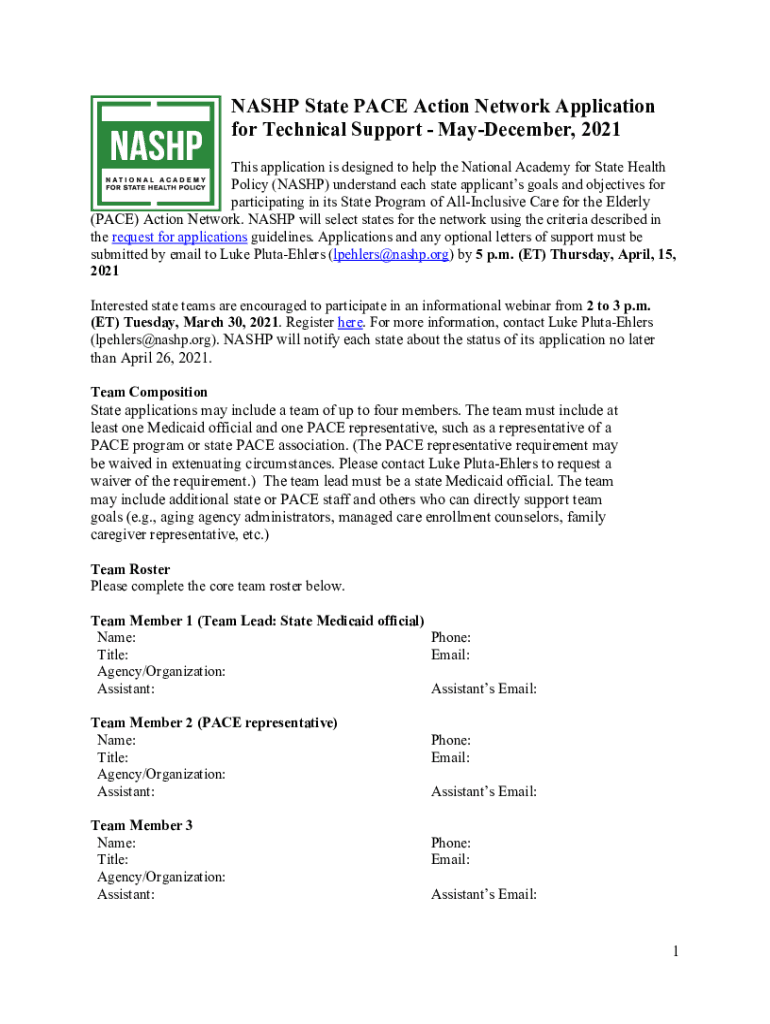 NASH State PACE Action Network Application for Technical Support May December 2021 This application is designed to help the National Academy for State Health Policy (NASH) understand each state applicants