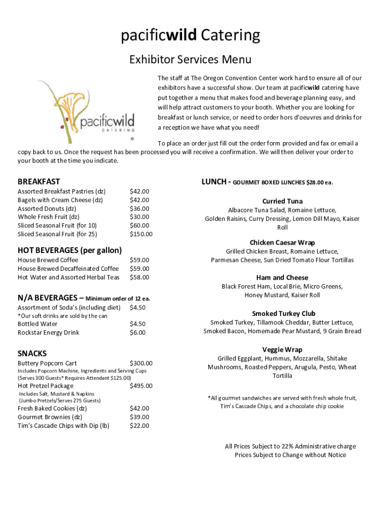 Pacific wild Catering Exhibitor Services Menu The staff at The Oregon Convention Center work hard to ensure all of our exhibitors have a successful show. Our team at pacific wild catering have put