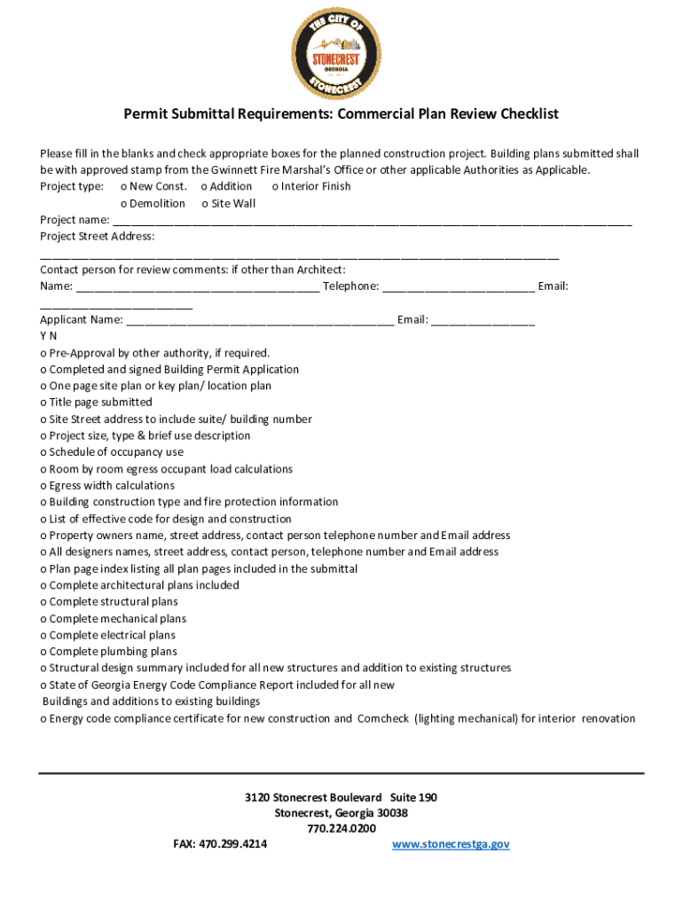 Permit Submittal Requirements: Commercial Plan Review Checklist Please fill in the blanks and check appropriate boxes for the planned construction project. Building plans submitted shall be with approved