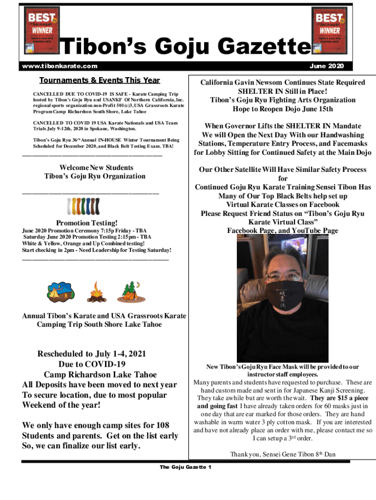 Tons Good Gazette www.tibonkarate.comJune 2020Tournaments & Events This Year CANCELLED DUE TO COVID-19 IS SAFE Karate Camping Trip hosted by Tons Good BYU and SANK Of Northern California, Inc. regional